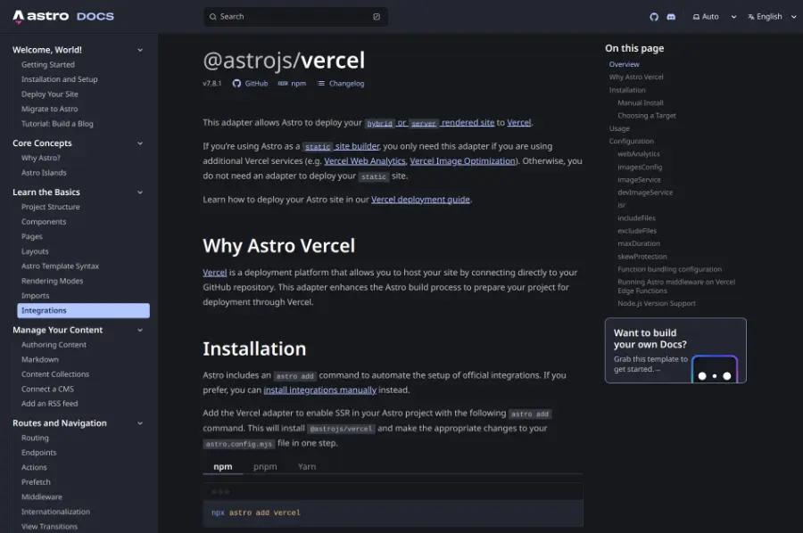 Deploy Astro projects with ease using serverless functions and edge functions.Vercel is a deployment platform that allows you to host your site by connecting directly to your GitHub repository. This adapter enhances the Astro build process to prepare your project for deployment through Vercel.