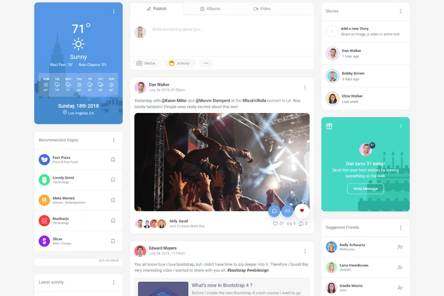 Friendkit is a social media UI kit that is based on Bulma, Saas, and Gulp. It comes with clean code, semantic Html, and Auto prefixing. So do not worry about dealing with code. Besides, it also includes UI details for an enhanced experience. styled autocomplete, Picro popovers, and beautiful widgets are special features of Friendkit.