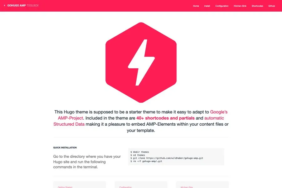 Gohugo Amp is a starter Hugo theme for Google’s AMP project and it's a simple theme to utilize. More than 40 shortcodes, partials, and structured data are all included in this theme, making it easy to include AMP elements within your content or your design.