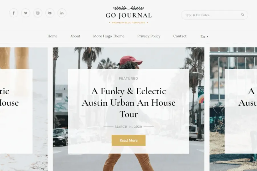 GoJournal is a minimalist Hugo magazine theme. The design of this theme is really clean, and it primarily focuses on readability. The hero area includes an attractive slider where you can present your featured article.
