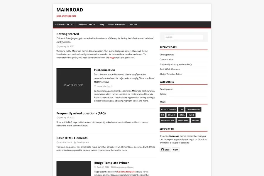 Mainroad is a free Hugo magazine theme that is inspired by MH Magazine'slight WordPress theme. It's a simple and clean theme that is responsive and content-focused.