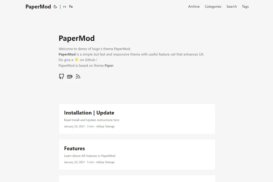 Looking for a clean, simple Hugo blog theme? Papermod is a free Hugo blog theme that is ideal for those looking for a simple method to express their ideas and writings on the web. Papermod's basic design focuses on making your contents shine.