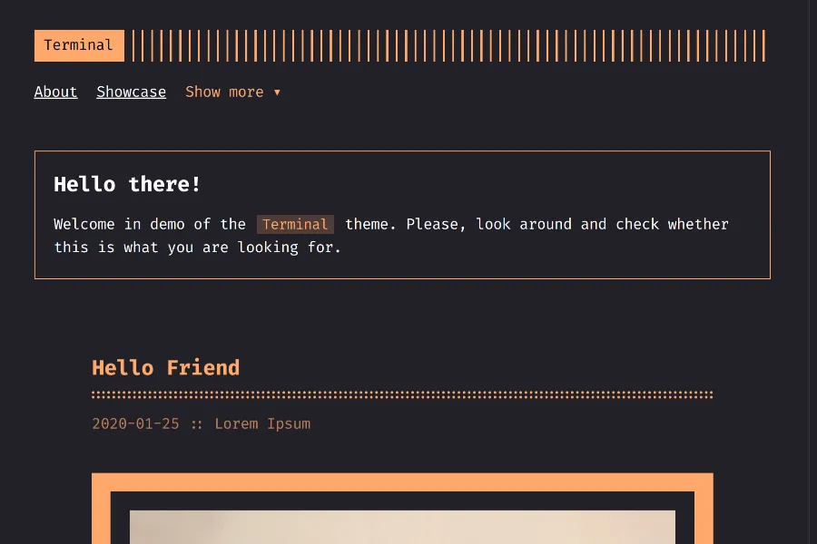 If you're looking for a retro theme for hugo with a creative appearance and feel and several basic features, Terminal is for you. It comes with five duotone colors (orange, red, blue, green, and pink) that you may modify to your satisfaction. The monospaced Fira code font is used in the theme, and it looks fantastic. Overall, the design is both responsive and mobile-friendly.