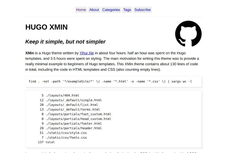Hugo Xmin theme was created to offer a very basic example to Hugo template learners. With five separate pages, the theme has a minimal amount of code. Though the theme uses a limited amount of CSS, a small bit of CSS customization can drastically alter the design.
