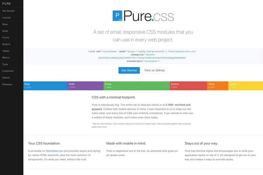 Pure.css is a responsive front-end framework from yahoo. It provides a well-documented, minimalist feature and can be an excellent alternative to the Bootstrap frameworks. No matter you want to create a custom website from scratch or a theme for WordPress, pure is the right choice as it provides almost all the necessary features to you.