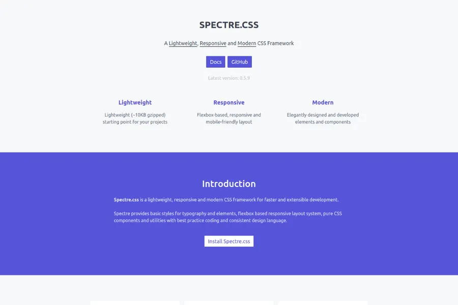If looking for a lightweight, sleek, modern CSS framework for faster development Spectre will be the right choice. It Is based on the flexbox layout system, and it features the basic style of typography and the elements.