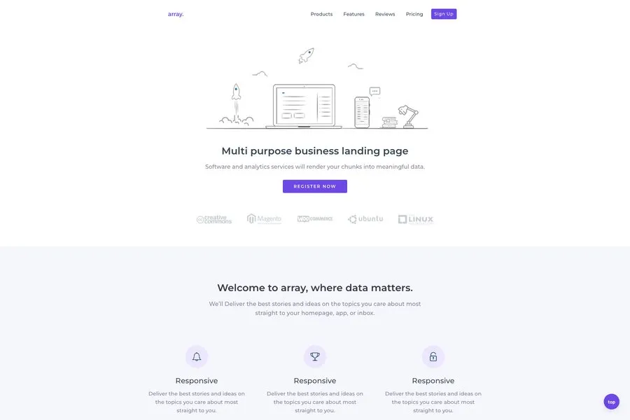 Array is integrated with mail chimp and contains all the necessary sections and elements for a perfect landing page. If you are looking for a straightforward landing page with eye-catchy graphical elements, you may consider this one.