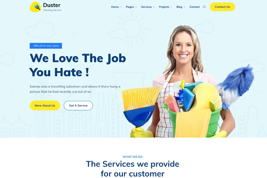 Duster is a modern React template built for cleaning service businesses that want a clean, professional online presence. With 25+ ready-made pages, it's easy to customize for your brand, and includes built-in email functionality. It uses icons from Flaticon, Font Awesome, and Themify, and comes fully responsive, so your site looks great on all devices. Designed with a minimal layout, Duster keeps things clear and focused for your visitors.