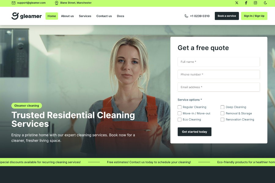 gleamer is a responsive Nextjs 15 template built for cleaning and maintenance businesses. Powered by Tailwind CSS 4 and React 19, it offers flexible layouts, TypeScript support, fast performance, and clean, reusable components. With light/dark mode, built-in auth, and Supabase integration, gleamer helps you build a professional cleaning business site faster.