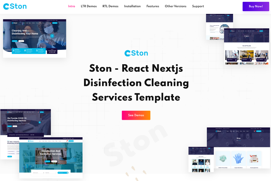 Ston is a modern cleaning company and disinfection React & nextjs template crafted for businesses in sanitization, pest control, and facility maintenance. It offers 3+ homepage variations, retina-ready, fully responsive layouts, and smooth CSS animations designed to help you launch a polished, professional website effortlessly