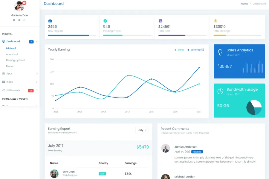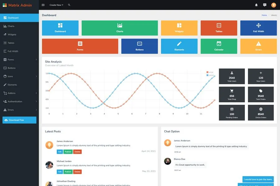 Matrix Admin is a versatile admin panel template that is an excellent creation of Wrappixel. The dashboard theme is simple, minimal, and lightweight and can save you valuable time easily. The design of Matrix Admin is a bootstrap flat admin template. If you are looking for such a template with featured pregnant functionalities, this backed theme can give a great treat. Curious about the reason, right? It's because behind a couple of powerful technologies like HTML5, CSS3, Media Queries, Bootstrap 3, and flat design.