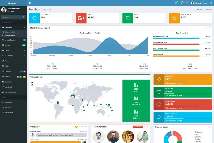 Apart from this, it features Grunt tasks and Bower dependency management. It allows you to use many jQuery plugins, and most interestingly most of the jQuery plugins can work without creating the directive. This bootstrap admin dashboard template also features nested routing and nested views. However, like the other modern admin template, this one is also responsive and supports almost every device and browser.