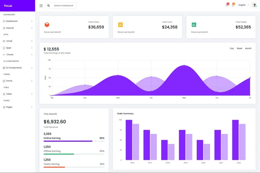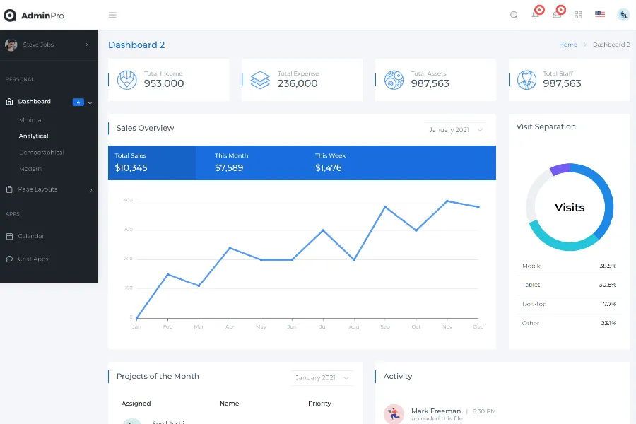 In addition, it is incredibly versatile and very suitable for your project. Besides, this bootstrap admin template also allows you to build any type of web app with ease. For instance, you can create: SaaS platforms, Project management apps, E-commerce backends, CRM systems, Analytics apps, Banking apps, etc.