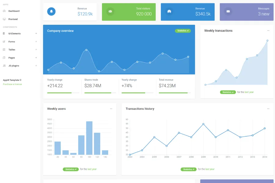 This bootstrap simple admin template has both premium and freemium options. The premium AppUI comes with a package that includes both admin and frontend templates. This simple dashboard template features custom page design, graphs, button layouts, sliders, form validation, and many more to ensure the best user experience.