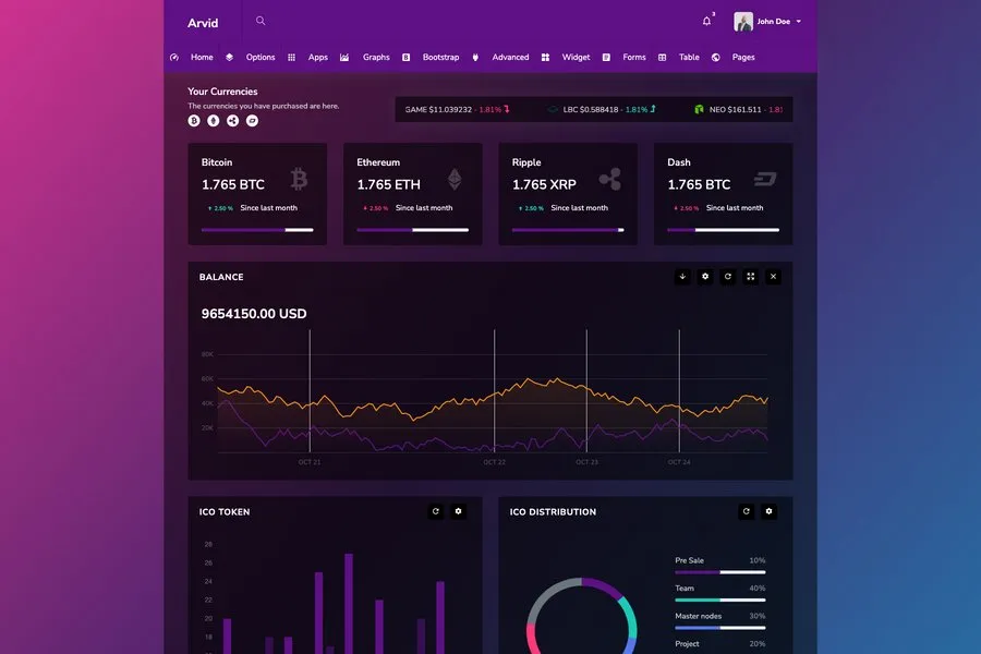 Arvid is a creative and perfect admin dashboard for Cryptocurrency. The developers include all the necessary features for a Cryptocurrency website. It provides a lot of customizable UI and elements for creating an excellent admin dashboard. It also features some unique features like fully automated workflow with a gulp, updating the full project with a gulp, NPM-based project development, and developer-friendly coding.
