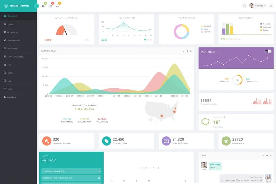 Bucket Admin is a bootstrap admin dashboard template that is designed based on the flat design concept. The specialty of Bucket Admin is developer-friendly coding, light color, easily customizable charts, and all other elements.