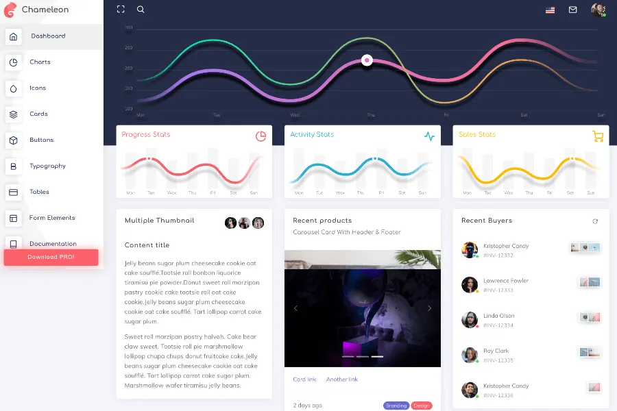 You can easily integrate this bootstrap dashboard theme into your project for creating an excellent design. All the components and layouts come in two different styles named classic and material. Apart from this, the menu layouts have six variations that allow a lot of convenience for the developers.