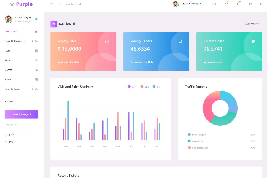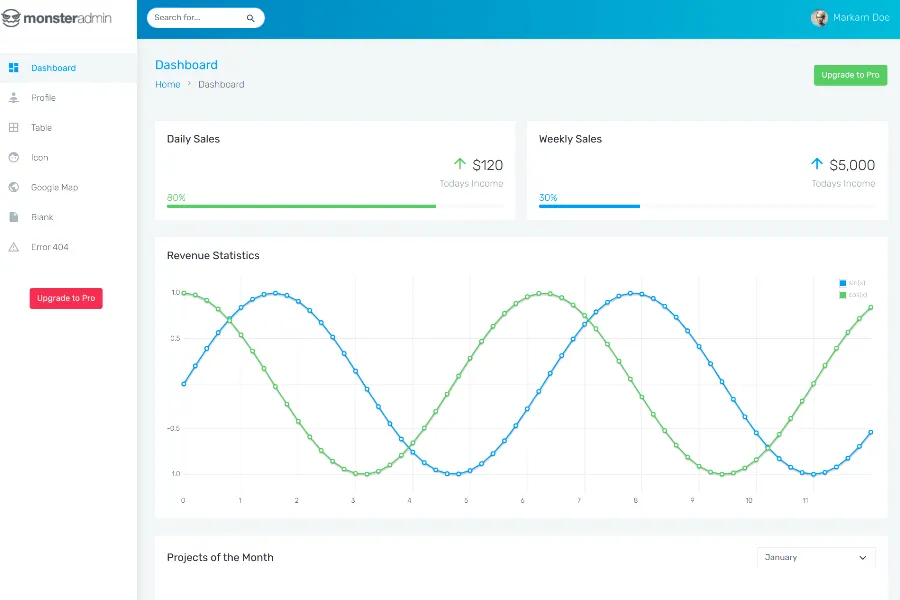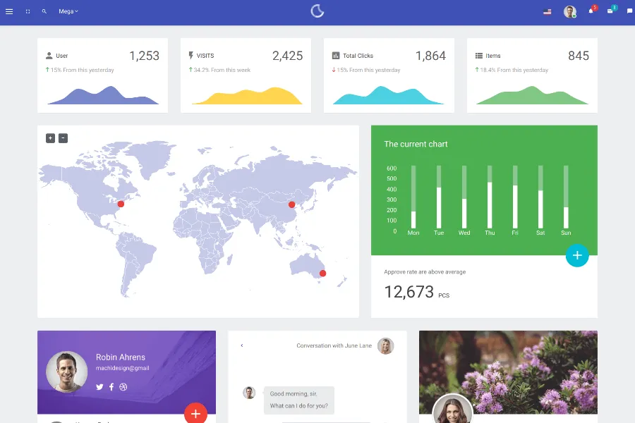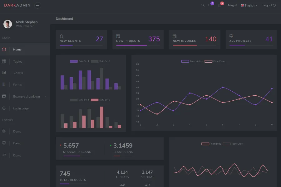 Monster Admin is a colorful and nice-looking admin dashboard template. The design is simple and clean and can fit with all viewing screens including mobile phones, desktops, laptops, notebooks, iPhones, tablets,s and more. Monster Admin comes with catchy graphs and charts to present your site's valuable data in a catchy way, that can fit your requirements with ease. The template is best for keeping online eCommerce analytics. It can track your site visit, sales, comment, and weekly visit. On top of that, the template is feature-packed, gluten with tables, panels, forms, multi-level dropdowns, chats, and more.