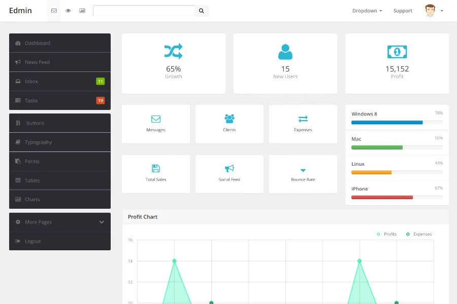 Edmin is the best bootstrap admin template powered by modern JQuery plugins. The clean backend template is easy to use and customize, and can fit any business requirement with fun. The backend template has an abundant supply of modern technologies including HTML, CSS, sleek typography, forms, buttons, chats, site design, and navigation.