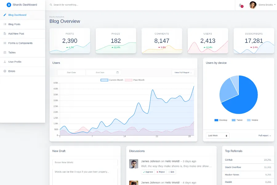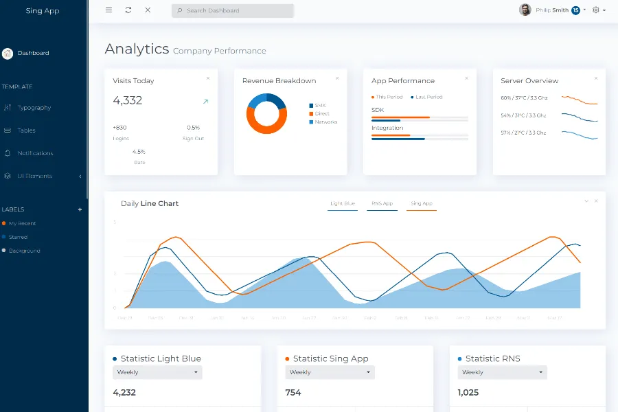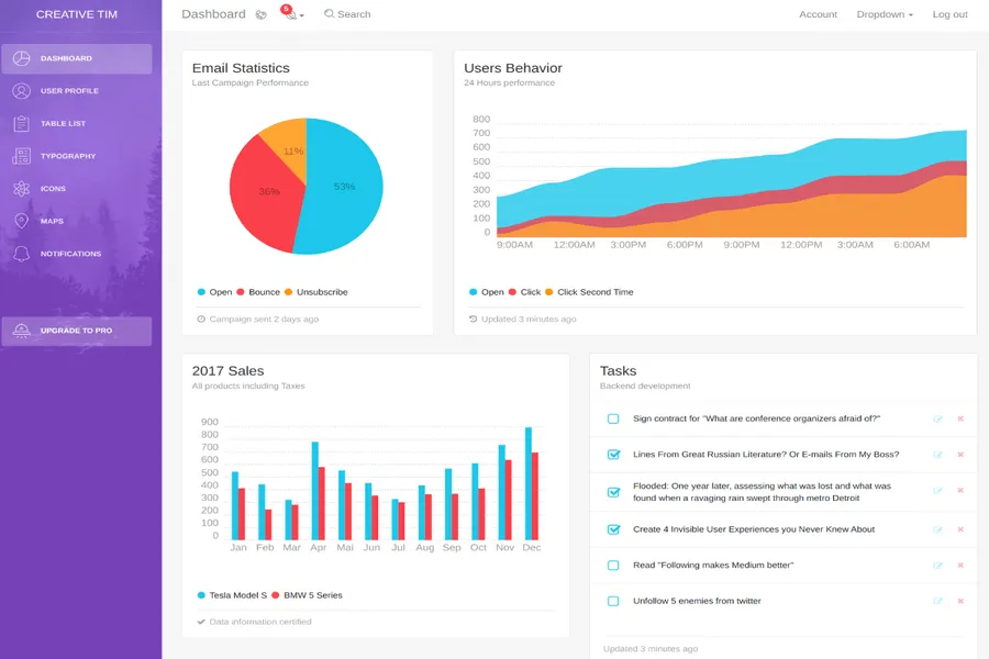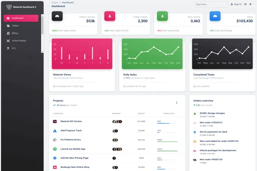 That means it can be used for any kind of web application - Project management, eCommerce backends, analytics, CRM, fitness, and more. All this versatility means cross-platform compatibility, with full support for desktops, tablets, and mobile devices. With 10+ UI components, 8 pages, form elements, Bootstrap tables, and cards, and guaranteed support, it's hard to believe that a feature-rich yet user-friendly admin dashboard template is free.