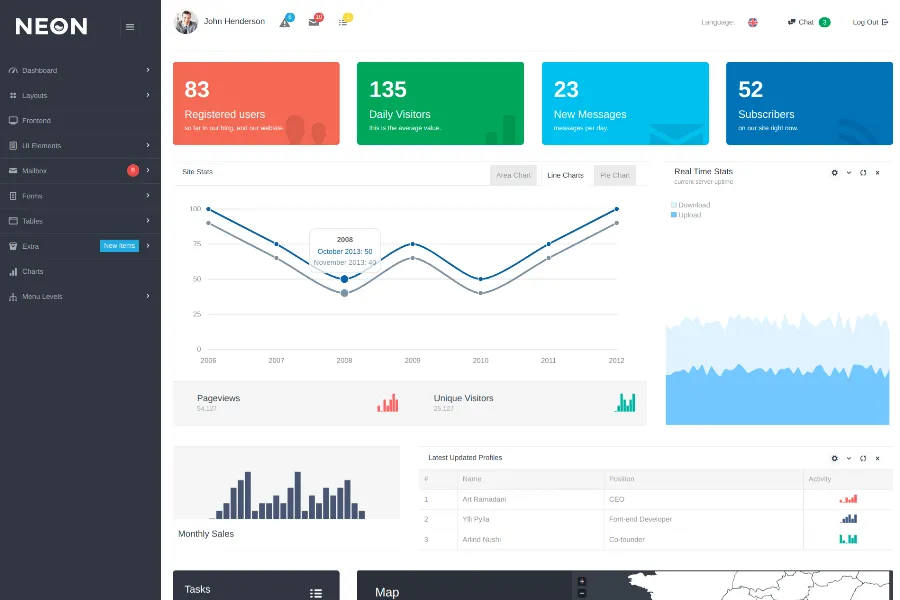 Neon is another modern, flat, and trendy Bootstrap Admin Theme for multipurpose uses. It is one of the top 10 admin themes of all time and was featured in Behance also. Neon includes more than 112 HTML files that are an incredible resource indeed for the developers.