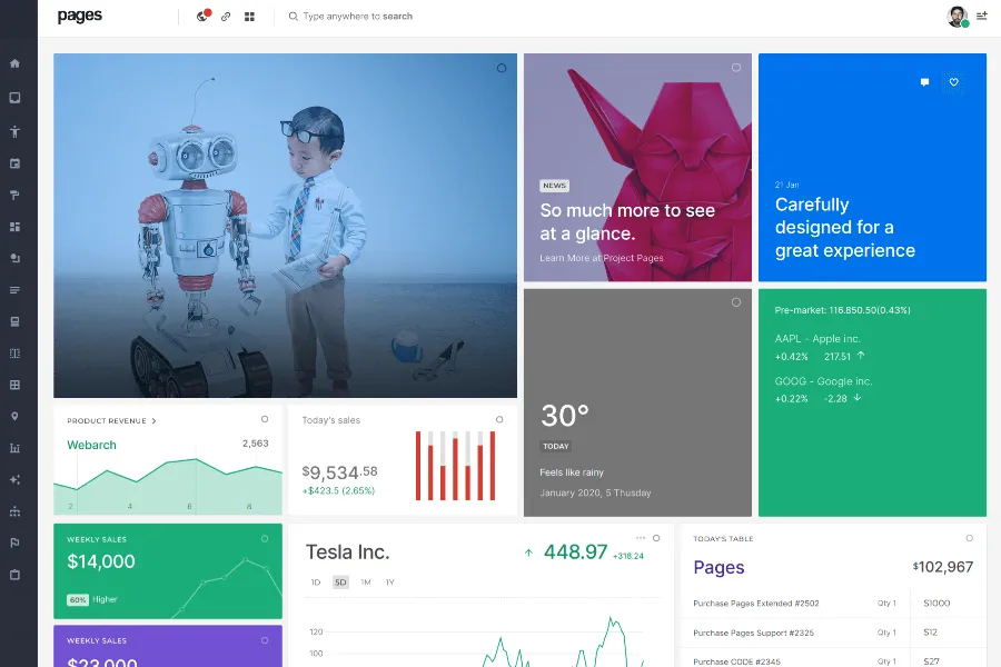 If you are looking for a speedy admin dashboard template, you can consider Pages. The developers of pages claim that their admin dashboard theme is so light that it is faster than light almost. However, it is a very trendy and fashionable admin dashboard template to build your web UI in a fast and quick way.