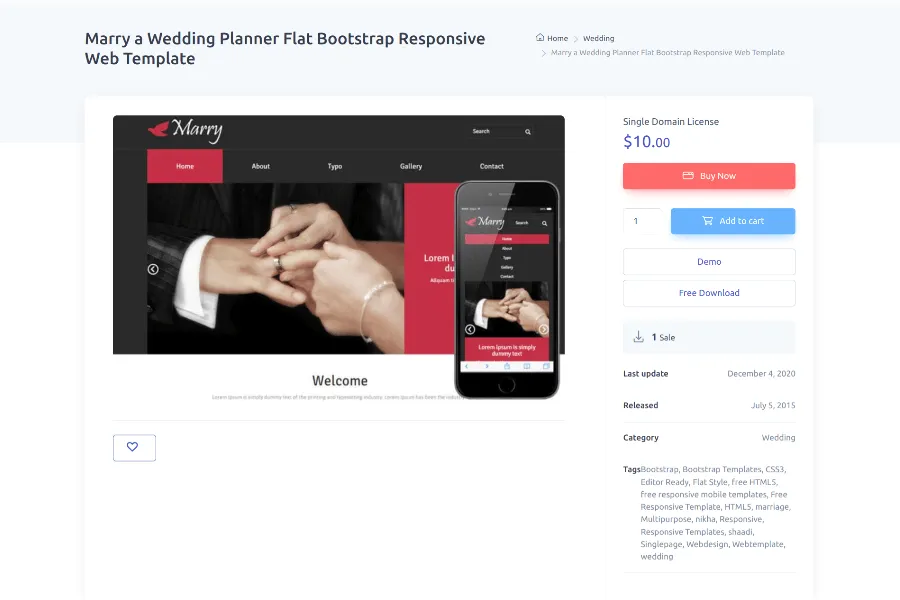 Marry is the best-suited wedding planner bootstrap template for wedding planners and event management companies. The template is clean, colorful, bright, catchy, and amazing can make your event planning successful. The design of this web template is flat, equipped with a boxed slider, project analytics, service, footer, about page, site component, gallery, contact form, and more.