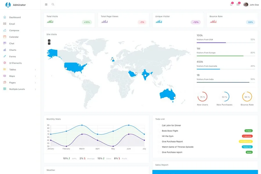 If you are looking for a professional HTML dashboard for free, Adminator could be a great choice indeed. This template is developed by Colorlib and it comes with an MIT license. Though it is a free dashboard template, you will find almost all the pro features in this template. as it is free, it has some limitations also.