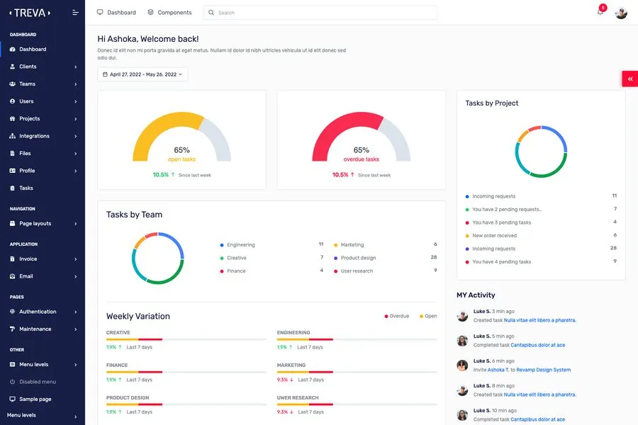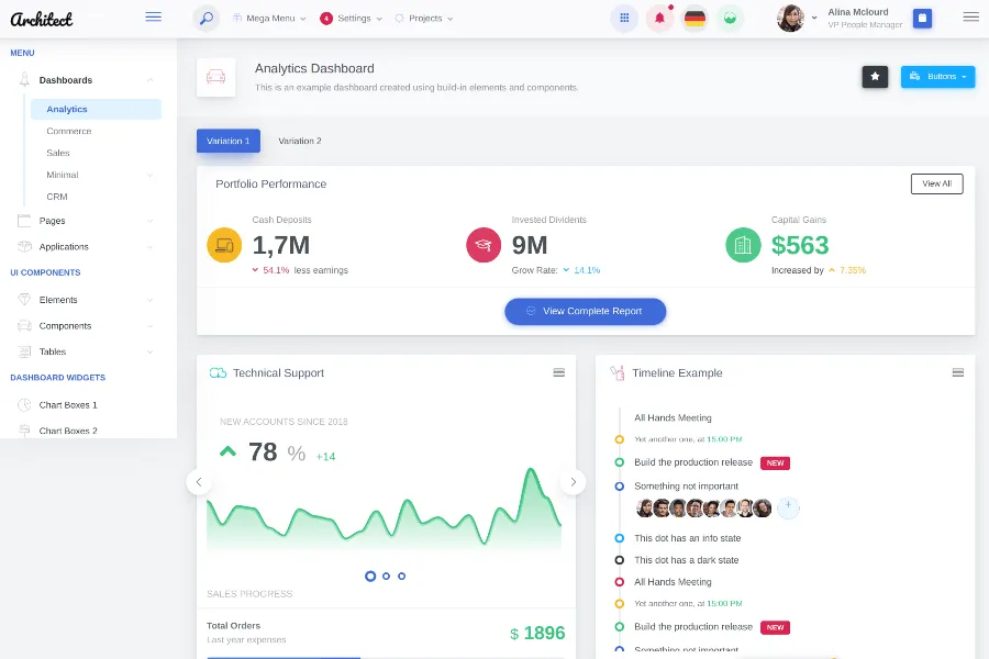 Are you looking for a combo package of event and analytics admin dashboards? Dlab comes with both event and analytics dashboards. Moreover, you have the flexibility to create a custom event project with the event dashboard. As this package includes a huge number of components and applications, you can handle different types of projects with this template.