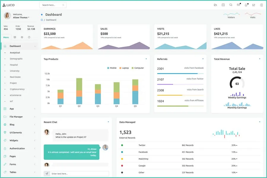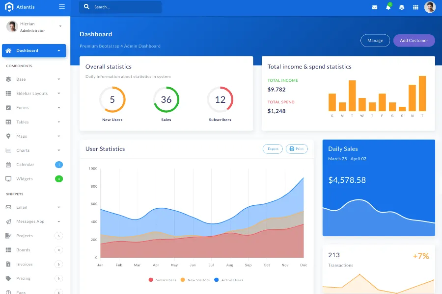 Developing a dashboard interface from the beginning is not an easy task. It takes a huge time and you need to invest a handsome amount also. In this case, Atlantis could be a good solution. This feature-rich free dashboard template comes with both the light and dark versions along with thousands of features.