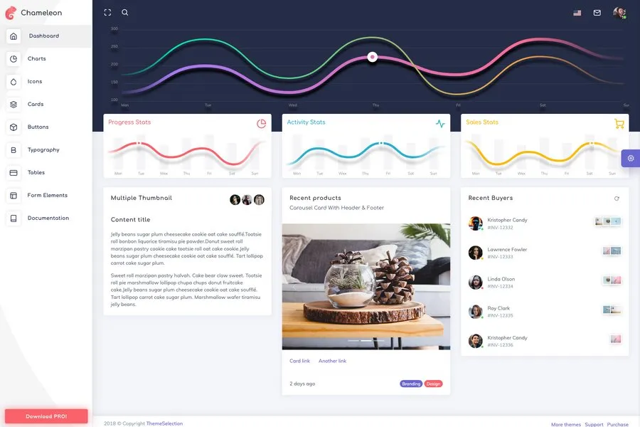 Are you looking for a modern and high-resolution free admin dashboard template? well, CHAMELEON ADMIN lite is could be a great choice indeed. Although it has a premium version. but, the free version is enough for the personal project. If you are a developer and know how to handle the code, then you need not buy the premium version at all.