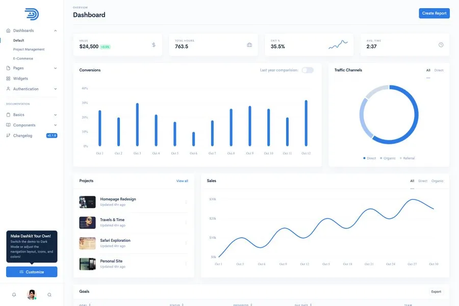 Dashkit is a very simple and clear admin dashboard template that includes a lot of components and elements. This template comes with both the light and dark versions. This developer-friendly template is integrated with the gulp tool. Dashkit offers three different unique dashboards for default, project management, and eCommerce purpose. So, you have the flexibility to start your project immediately with this outstanding and feature-rich admin dashboard template.