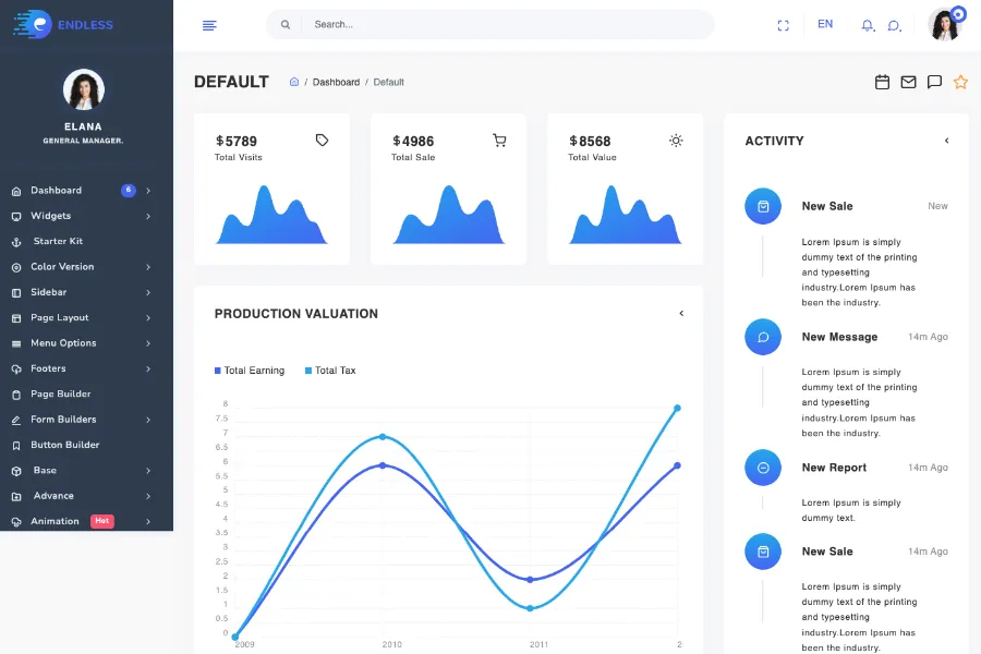 This template is suitable for creating SAAS, CRM, CMS, and admin dashboards. Since it supports Multilanguage, you have the felicity to use this template for versatile projects.