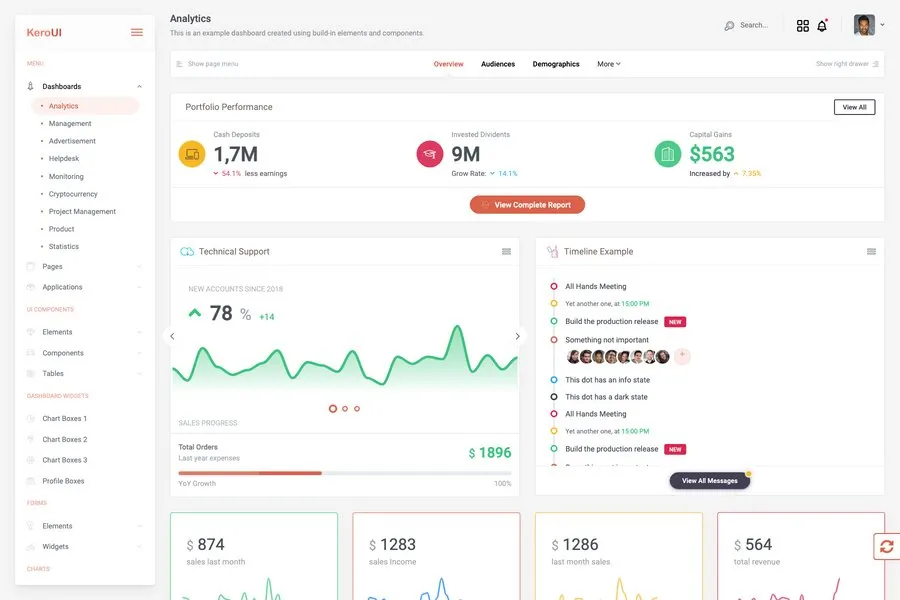 If you want to show your data uniquely and creatively, then you could consider Kero. This one is a fabulous and marvelous-looking dashboard template. it comes in two different versions. one is the Horizontal version and another is the Dashboard with a sidebar.
