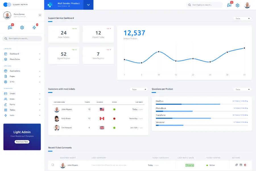 This one is another awesome dashboard template from COlorlib. KIAALAP comes with a lot of alternatives to components. Moreover, it comes with three dashboard variations with a professional and unique appearance. This template is suitable for creating different types of a project like CRM, CMS, project admin dashboard, and custom admin dashboard. A neat and clean appearance with the W3C standard coding style makes this template popular with the developer. The main features of this premium admin dashboard template are 50+ pages, a google material design concept, a lot of chats, tables, and UI components.