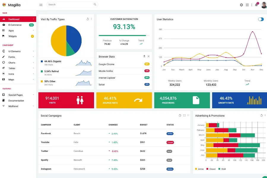 Are you looking for a web app template for the control panel and admin dashboard? Well, you could explore Magilla. This awesome responsive HTML admin dashboard template is based on SAAS, CSS, and bootstrap framework. This template includes all the necessary features like plugins and components to kickstart a project.