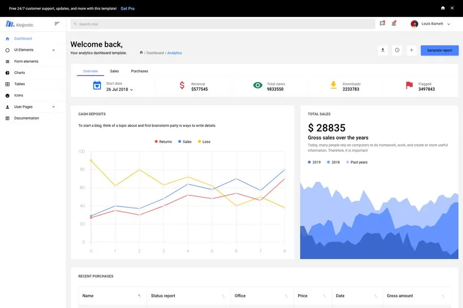 Majestic is a free HTML dashboard template that is crafted with bootstrap, SAAS, Jquery, HTML5, and CSS. This free dashboard template comes with a stunning design, super smooth user-friendly UI, easy customization option. yes, it is responsive in appearance. Anyway, the main features of this template are neat and clean appearance, well documentation, easy handling, necessary elements and components to start a dashboard project quickly. Moreover, it includes the login, register, and lock screen page with alternatives also.