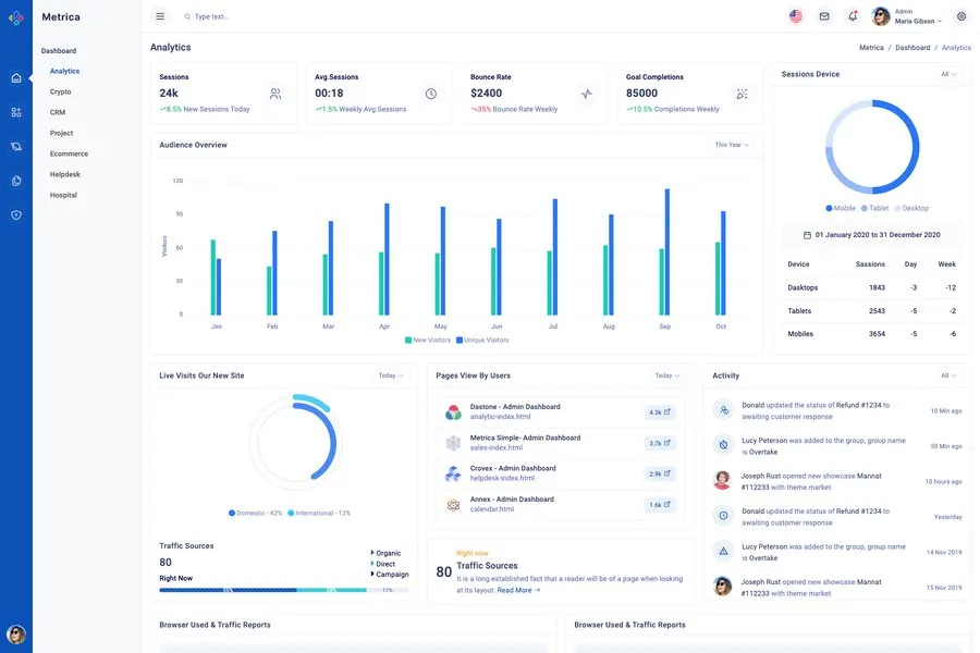 Metricia is based on Bootstrap v4.3.1. you can use this dashboard template and UI kit for multipurpose like Analytics, Crypto, Project management, eCommerce, CRM, helpdesk, and hospital systems. That means this package is enough for the developers who provide freelance service or the people who have different types of projects.