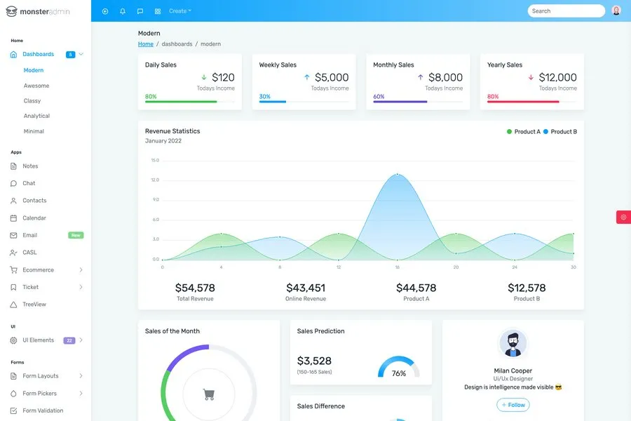 Monster is another awesome HTML and bootstrap admin dashboard template from Wrappixel. This one comes with a lot of alternatives and a straightforward design. It offers 5 unique dashboards as well as other necessary segments.