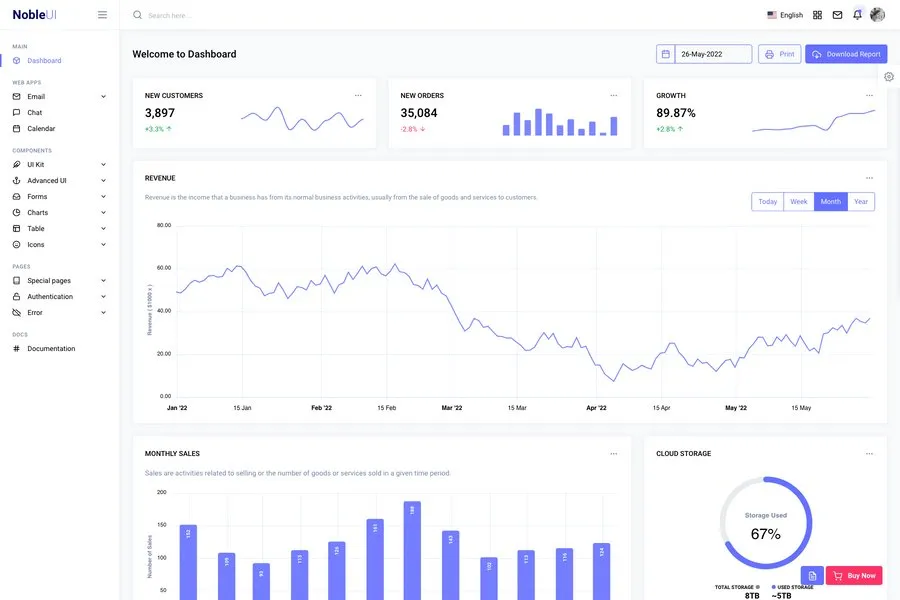 This feature-rich template comes with 50+ pages, 20+ ready-to-use Angular components, and a lot of reusable components and plugins. Moreover, it has 5 unique dashboard demos. So you have the flexibility to kickstart your web application.
