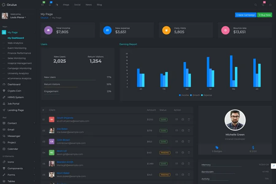 Looking for a multipurpose bootstrap admin dashboard template? well, you could explore Oculux. This template comes with a lot of components and web elements. You can use this template for building a Hospital dashboard, HRMS, Job portal, eCommerce, cryptocurrency, and Finance. It comes with 30+ dashboards and 800+ pages. So, without any doubt, this one is a game-changer dashboard in this list.