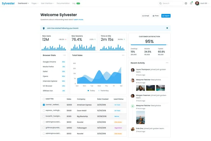 Sylvester is HTML 5 and saas based solid admin dashboard template. This one is specially designed for the developer so that they can handle this template effectively. This feature-rich template comes with some outstanding features like 3 prebuilt dashboards, 60+ HTML pages, and 1000+ components. This template is suitable for creating CRM, statistics, project management, and analytics.