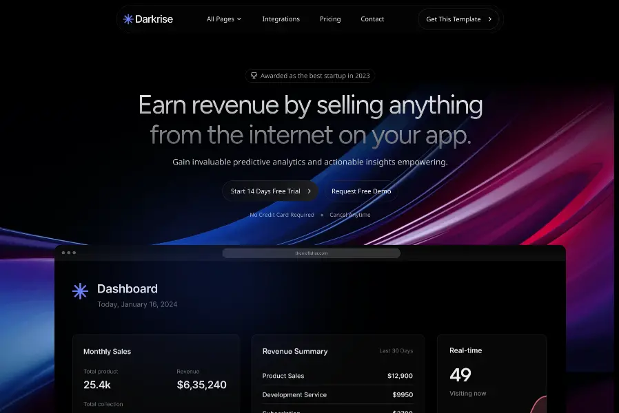 Darkrise is a premium SaaS and startup-focused dark theme built for clarity and elegance. Perfect for app landers and product showcases.