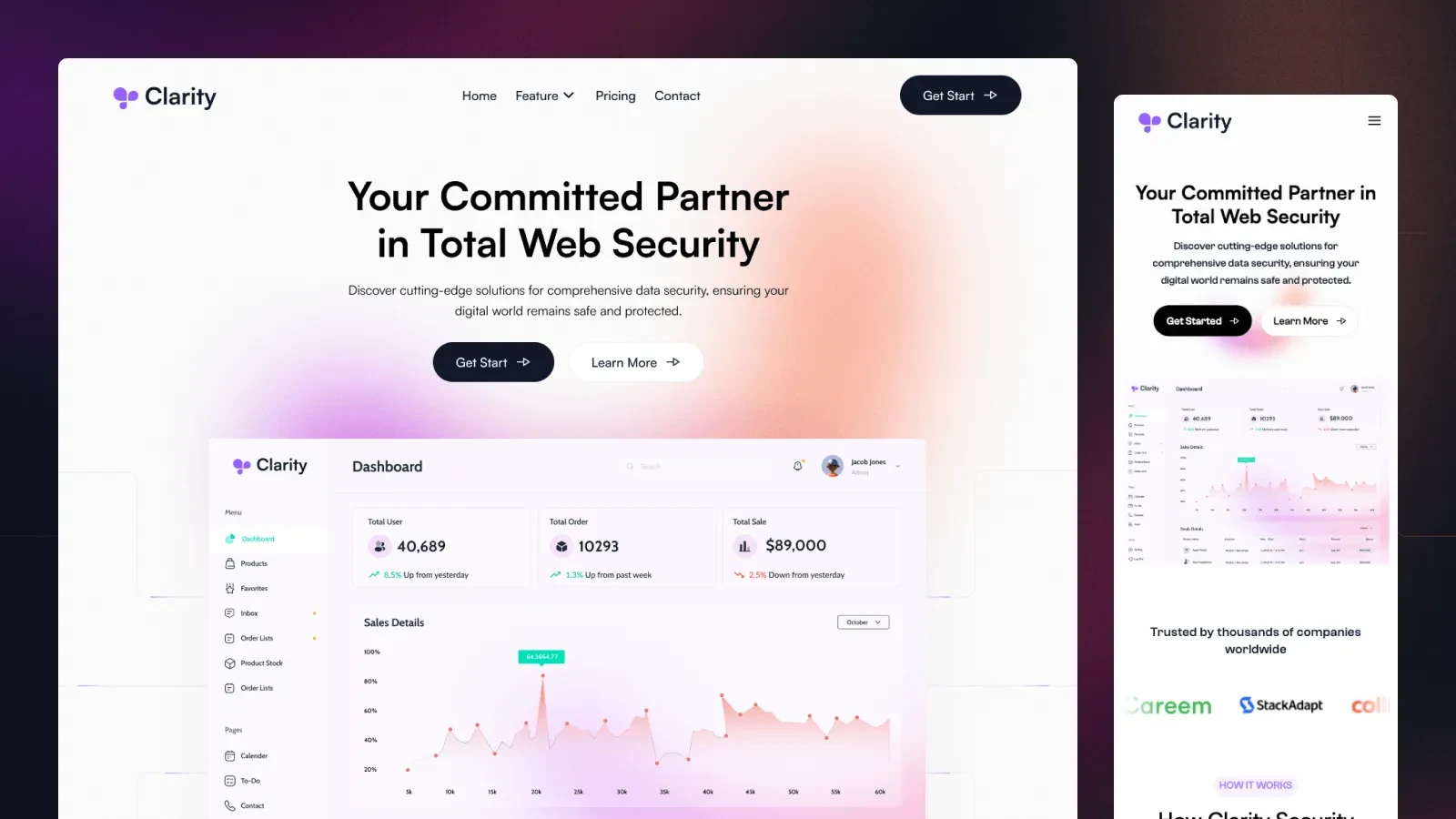 Clarity is built around simplicity and credibility, with clear feature breakdowns, strong CTAs, blog and documentation support, and smooth animations for presenting AI workflows. It's easy to rebrand for any industry, including healthcare, SaaS, or enterprise AI.