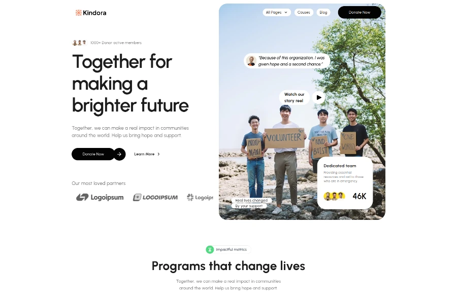 Kindora is a modern NGO website template designed for non-profits, NGOs, charities, and fundraising organizations, offering a clean and elegant design. It’s built on the Astro framework, with Tailwind CSS. It provides great usability and fast loading speed.