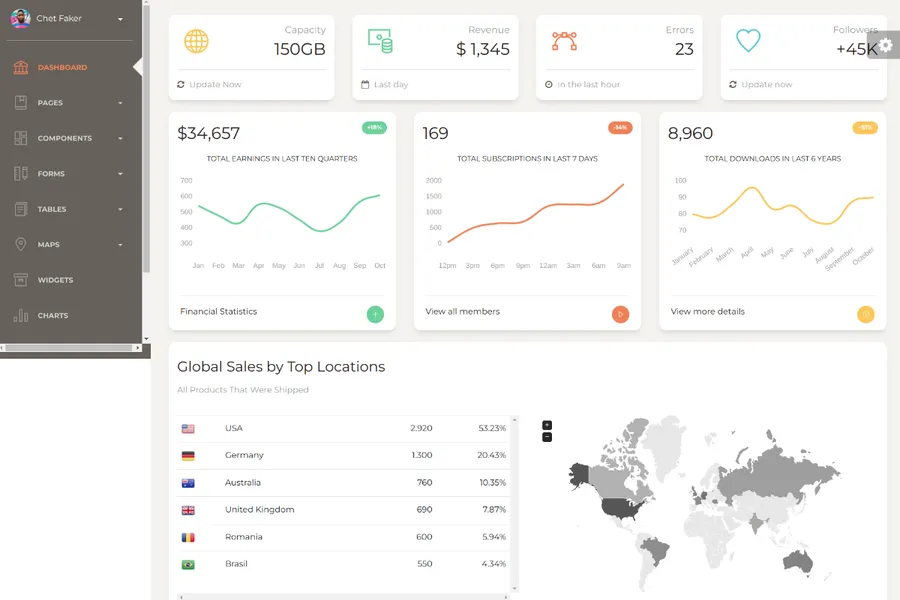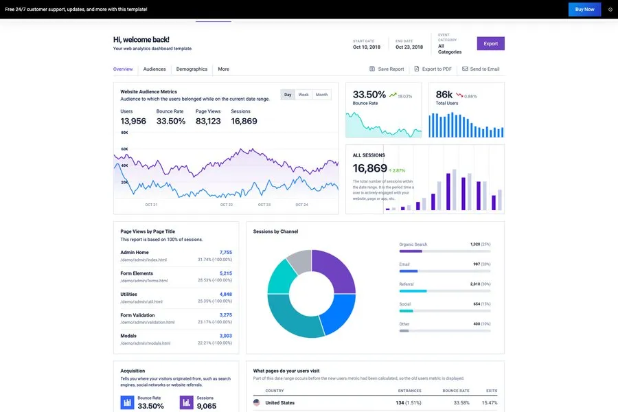 If you want the glam to shine on your dashboard, Azia is the one for you. It has the simplicity to show you all the stats and also has the diversity to show in-depth details of your data. It has some of the most creative elements and design tools that make it an elegant choice for professional analysts.