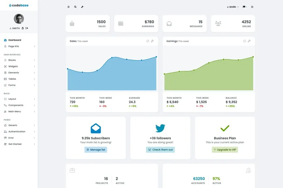 Codebase is a full package with a welcome screen, top layered forms, and many more to inspire you. The total package is full of a lot of widgets, and blocks. There are even some of the statistic widgets that have changeable backgrounds to identify quickly. If you want to set up a media-related website or blogging site, it also has some of the elements that are super simple and ready to be used on the websites. For user verifications, you will get a ton of pages and forms that you can choose according to your theme.