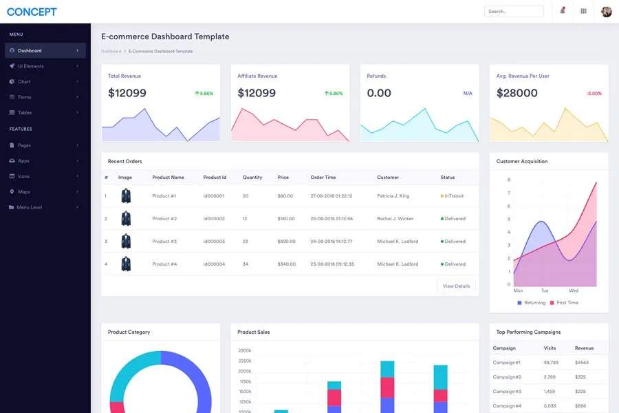 Concept bootstrap simple dashboard does come with all the things that a user always needed. Due to the design and light coding, it notches up in the performance area. The admin panel does not take a lot of CPU power and RAM to run on a browser. This dashboard is one of the favorites for e-commerce site developers because of the modules and infographics. They are specially made for product monitoring, visitor counting and sales, and all the financial calculations.