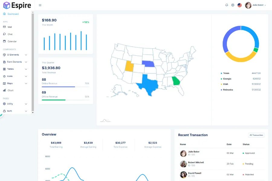 It is a customizable template with several pre-built components, charts, and page templates. This template comes with 1 year of premium support and free updates. You can create a Chat app, Calendar app, User profile, Email app, and more.