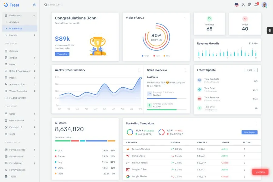 If you are an advanced developer and you don't want to compromise anything on your dashboard, Frest is the one for you. It is an advanced template that has the support of Laravel and HTML and yet looks super minimal for modern users. In the design aesthetics, they have added clean ad clear cards that are super responsive that can also be used on mobile phones. The sidebar animations make it more intuitive to the users and keep it hooked up to the customers. The animations and actions on this theme are unreplaceable for the others in the market.